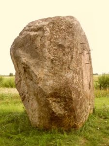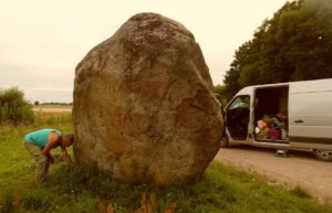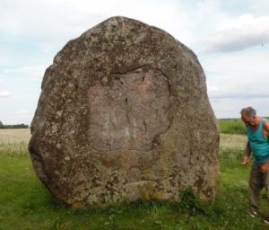 We gingen op weg naar de laatste megaliet in Litouwen, niet heel ver van de Poolse grens, Kalesninku Akmuo (54.192270 / 24.802050). Er waren goede asfaltwegen tot op 2 km afstand van ons doel; we stuitten echter op een wegopbreking en moesten 8 km over een ribbeltjesweg rijden – een hel voor Margrete. Het laatste stukje weer asfalt, weg 127. We zagen ‘m al van verre, een grote steen, wel erg dicht langs de weg. Heel vroeger waarschijnlijk een prima plek, waar reizigers niet aan voorbij konden zonder aandacht aan hem te schenken, maar waar nu de auto’s langs sjeesten. En nog ‘n schok: er waren 6 ijzeren stangen in hem geboord; uitsteeksels die misschien ooit als reclamebord dienden.