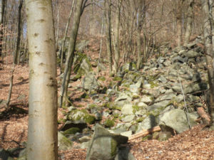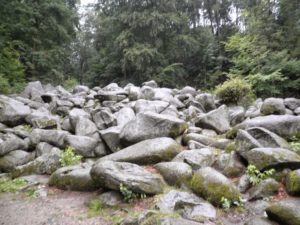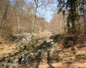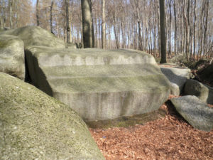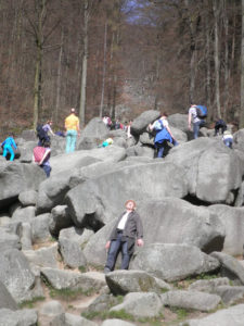 Vandaar verder naar Bentheim, de Felsensee. Een heel merkwaardig natuurverschijnsel bevindt zich hier: een stevige heuvel, of kleine berg, waarvan de helling vol ligt met vrij ronde stenen, van minstens een halve meter tot wel een hele meter doorsnee, enkele zelfs nog groter. Zoals het er lag zou je denken: wie heeft deze speeltuin hier aangelegd? Want het is natuurlijk fantastisch voor kinderen om overheen te klauteren, van de ene granietbol naar de andere stappend, soms springend. En voor kleintjes die moeten worstelen om überhaupt bovenop zo’n bol te komen. Of voor anderen die er tussendoor de heuvel af te rennen alsof het een ski helling is. En dan de ouders op het pad aan de zijkant bezorgd roepend om toch voorzichtig aan te doen. Hoeveel kinderen zullen dat gehoord hebben? Maar wat een genot, zo’n merkwaardige speling van de natuur en al die spelende kinderen.