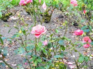 De antieke rozenstruiken in de ronde perken spraken als met één mond.