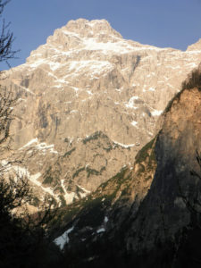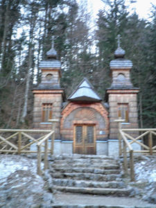 Vroeg in de avond kwamen we in de sneeuw vlakbij de Vrsic pas, bij Kranska Gora, bij toeval langs een prachtige authentieke houten Russische kapel, opgericht ter herdenking van de 400 Russische dwangarbeiders die daar bij een lawine zijn omgekomen. Hier hoefden we geen ritueel te doen, omdat de kerk op zich al als herdenkingsplaats fungeert.